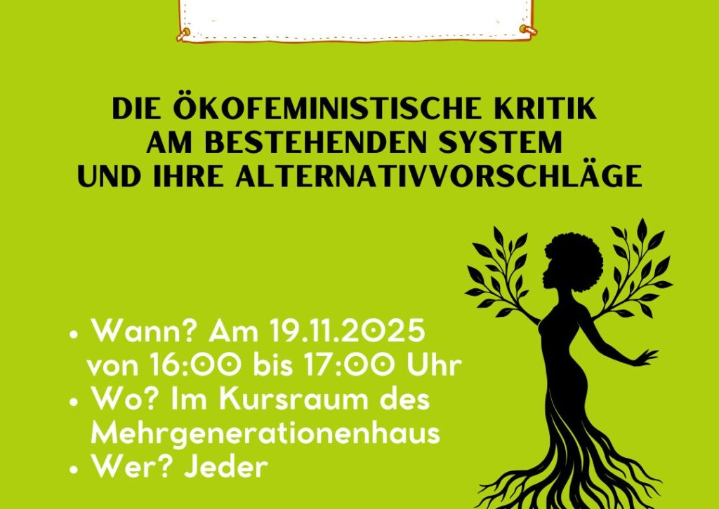 Ökofeminismus ist viel mehr als Ökologie + Feminismus. Es ist eine Vision für Gerechtigkeit und Nachhaltigkeit. Was sind die Hauptkritikpunkte dieser Bewegung zum derzeitigen System? Welche Alternativvorschläge macht sie? Komm gerne in dieser nachhaltigen Pause, um mehr Einblicke davon zu bekommen und in den Austausch zu kommen! Wir freuen uns über euren Besuch!