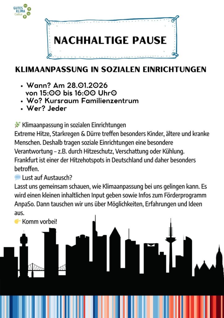 In dieser Nachhaltigen Pause geht es um die Klimaanpassung in sozialen Einrichtungen. Komme gerne zu dieser nachhaltigen Pause, um mehr Einblicke davon zu bekommen und in den Austausch zu kommen! Wir freuen uns über deinen Besuch!