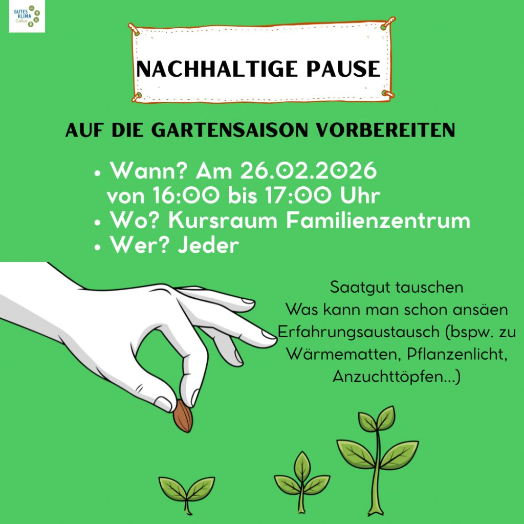 In dieser Nachhaltigen Pause geht es um die Einstimmung auf die Gartensaison. Wir können untereinander Saatgut tauschen, denn meist benötigt man von einem Saatgut-Tütchen oder auch der eigenen Saatgut-Ernte nur einen Bruchteil und hätte dafür gerne noch ein paar andere. Wir tauschen uns aber auch dazu aus, was man schon ansäen kann und welche Erfahrungen man vielleicht gemacht hat, einen früheren Start zu ermöglichen durch Wärmematten und Pflanzenlicht.