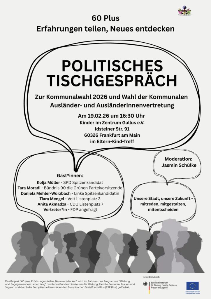 Im Rahmen der Kommunalwahl 2026 und der Wahl der Kommunalen Ausländer- und Ausländerinnenvertretung, lädt der Verein Kinder im Zentrum Gallus e.V. zu einem Politischen Tischgespräch ein. Wir wollen gemeinsam mit Frankfurter Kommunalpolitiker*innen ins Gespräch kommen, um über Demokratische Teilhabe, das kommunale Wahlsystem, Entwicklungen der nächsten Jahre in Frankfurt und die Zukunft unserer Stadt zu diskutieren. Wir freuen uns, auf Ihr Kommen und Ihre Teilnahme am Gespräch!